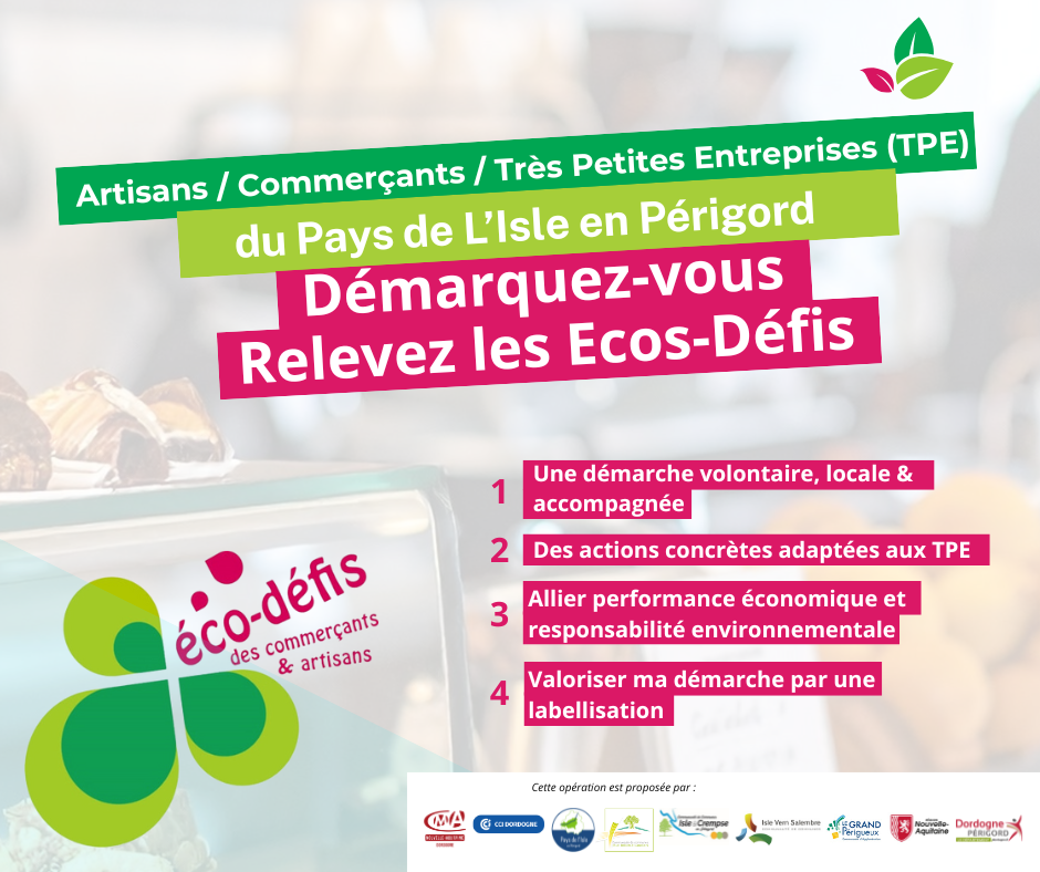Les Eco Défis est un dispositif d’accompagnement individuel pour les Très Petites Entreprises (TPE) du Pays de l’Isle en Périgord qui s’engagent à mettre en place des actions concrètes en faveur de la transition écologique et énergétique. Les Eco Défis se déclinent en 40 défis potentiels, autour de 6 thématiques majeures du développement durable en entreprise.